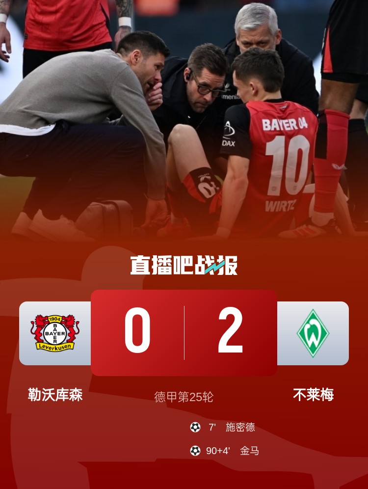 德甲第25輪,勒沃庫森0-2不敵不萊梅,結(jié)束23輪不敗。上半場(chǎng),斯塔格助攻施密德破門,維利科維奇進(jìn)球被吹越位,阿萊克斯-加西亞任意球中框;下半場(chǎng),替補(bǔ)登場(chǎng)的維爾茨傷退,伯克打入一球被吹越位,金馬鎖定勝局。