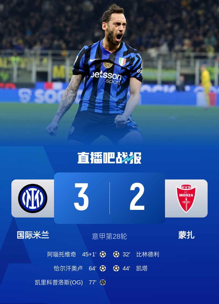 意甲第28輪,國米3-2逆轉(zhuǎn)蒙扎。上半場(chǎng),勞塔羅破門被吹無效,圖拉精彩撲救,比林德利首開記錄,凱塔遠(yuǎn)射世界波,阿瑙托維奇扳回一城;下半場(chǎng),恰爾漢奧盧凌空抽射扳平,勞塔羅頭球造烏龍,小圖拉姆推射中柱。