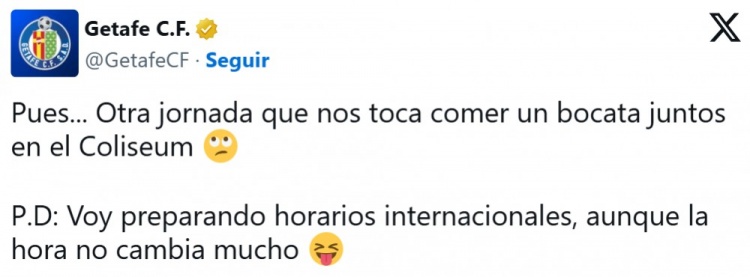 赫塔菲將于本周日下午14:00對陣馬競,而他們下個主場對陣萊加內(nèi)斯的比賽也是在下午14:00進行。與此同時,西甲聯(lián)賽宣布了第29輪的賽程,赫塔菲再次在下午14:00主場迎戰(zhàn)比利亞雷亞爾,俱樂部在社交網(wǎng)絡上調(diào)侃這一賽程。