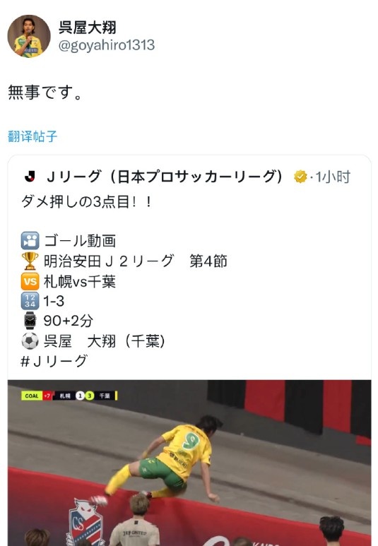 好在經(jīng)過(guò)一番檢查,吳屋大翔并無(wú)大礙,并回到球場(chǎng)繼續(xù)比賽,比賽結(jié)束后,吳屋大翔也轉(zhuǎn)發(fā)了自己“出糗”視頻,并寫道“平安無(wú)事。”,再次讓球迷們安心。