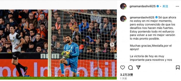 賽后瑪瑪達(dá)什維利更新社媒致歉,他寫(xiě)道:“我清楚自己目前并不在最佳狀態(tài),但是困難會(huì)讓人變得更加堅(jiān)強(qiáng),接下來(lái)我會(huì)盡我所能拿出最佳水平。非常感謝梅斯塔利亞球迷們的支持!這場(chǎng)勝利非常重要,并且讓我們打起干勁繼續(xù)應(yīng)對(duì)之后的每一場(chǎng)比賽。繼續(xù)前進(jìn)!”