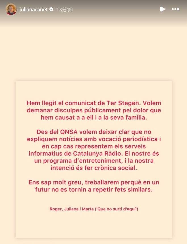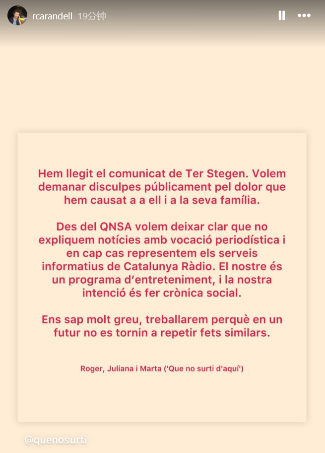 從節(jié)目《Que no surti d’aquí》的角度,我們想明確表示,我們并非以新聞視角報(bào)道事件,也不代表加泰羅尼亞廣播電臺(tái)的新聞服務(wù)。我們的節(jié)目是娛樂(lè)性質(zhì)的,我們的目的是進(jìn)行社會(huì)紀(jì)實(shí)。