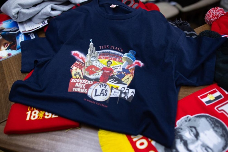 在距離利物浦主場(chǎng)安菲爾德只有5分鐘步行路程的一家商店里,你可以看到當(dāng)?shù)卣诔鍪垡患?0鎊的T恤,上面印有目前利物浦這座城市的標(biāo)志:樂隊(duì)披頭士和The La's、地標(biāo)性建筑皇家利物大廈和利物浦電臺(tái)城塔,以及薩拉赫。