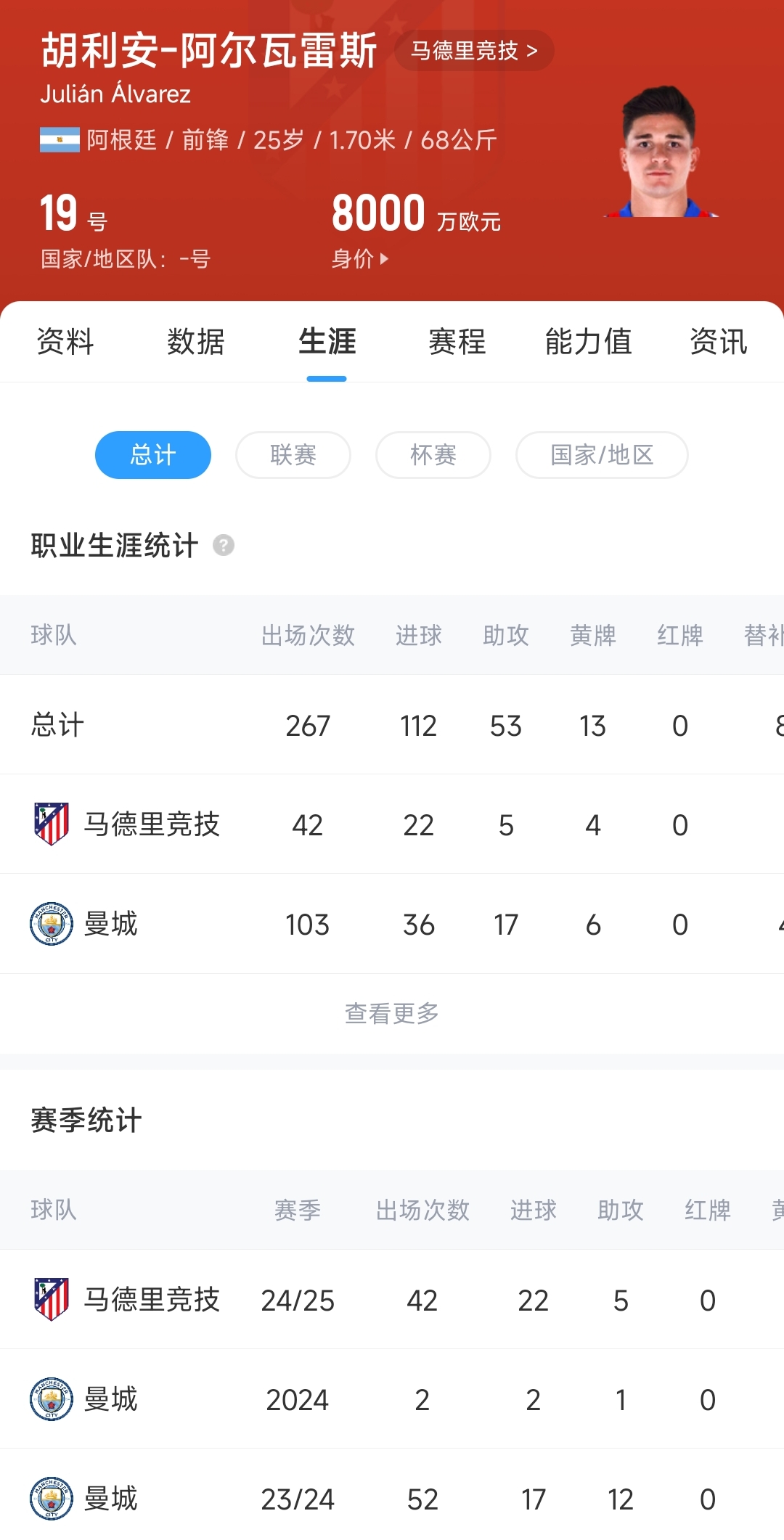 阿爾瓦雷斯本賽季數(shù)據(jù):42場(chǎng)22球5助