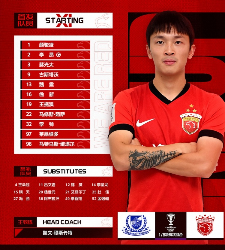2024/2025亞冠精英聯(lián)賽1/8決賽次回合,橫濱水手vs上海海港,今日首發(fā)名單。