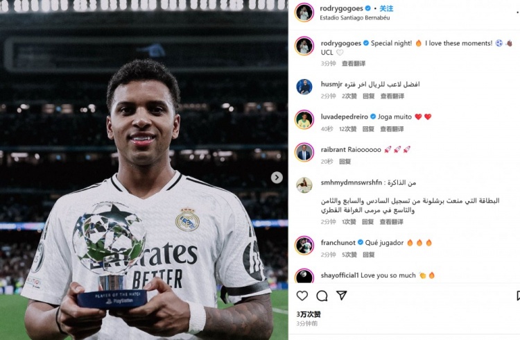 羅德里戈在賽后被歐冠官方評(píng)為本場(chǎng)最佳球員,他也通過(guò)社媒曬出自己手捧獎(jiǎng)杯的照片,并配文:“特別的夜晚!我愛這樣的時(shí)刻!??????????歐冠”