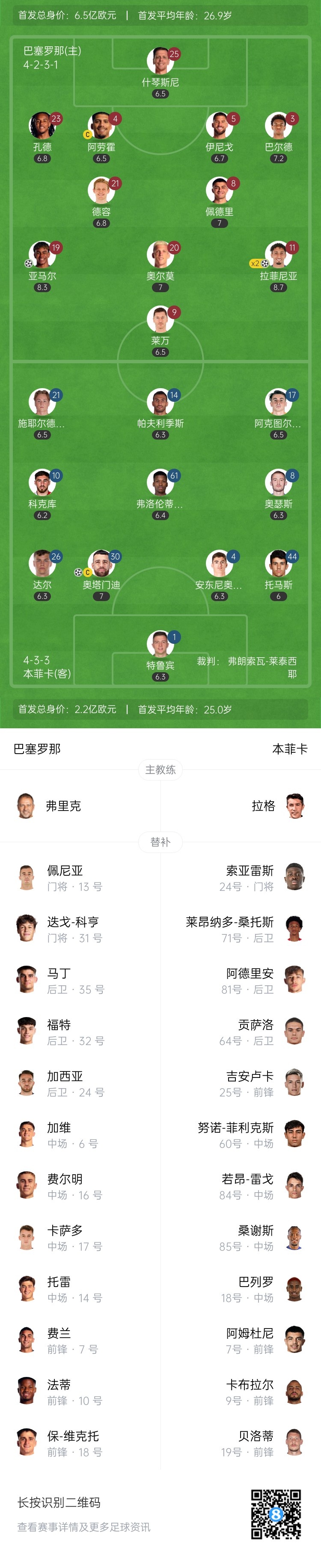 - 半場-巴薩3-1本菲卡總比分4-1領(lǐng)先 亞馬爾傳射拉菲尼亞雙響