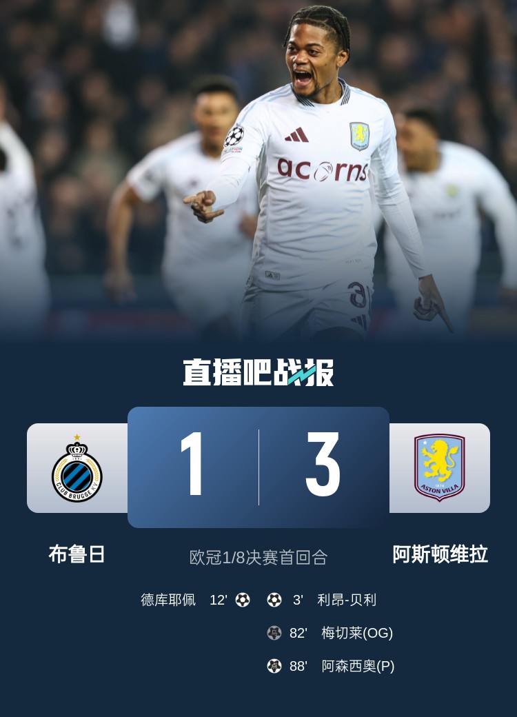 歐冠1/8決賽首回合,維拉3-1布魯日占先機。上半場,明斯助攻貝利閃擊得手,德克伊珀推射扳平;下半場,阿森西奧替補造險,措利斯失單刀,羅杰斯造梅切勒烏龍,卡什造點阿森西奧點射擴大比分。