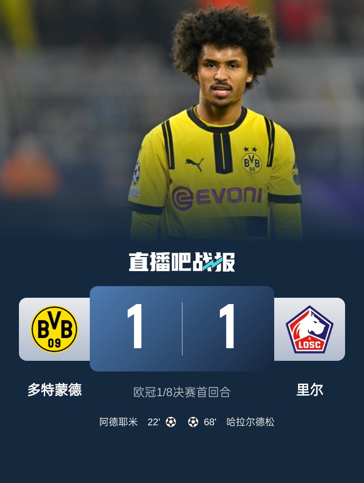 歐冠1/8決賽首回合,多特1-1里爾。上半場,阿德耶米造險+貼地斬破門,格羅斯進球被吹;下半場,哈拉爾德松扳平比分。