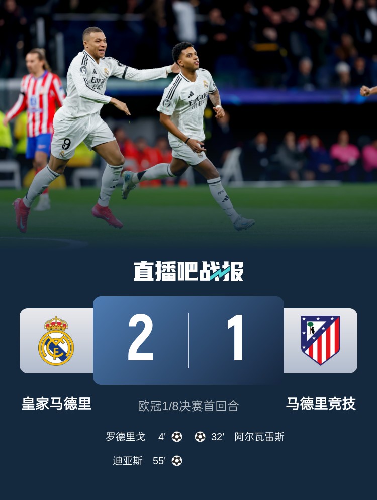 歐冠1/8決賽首回合,皇馬2-1馬競,占據(jù)晉級先機。上半場,巴爾韋德助攻羅德里戈內(nèi)切擺脫防守破門,阿爾瓦雷斯過掉卡馬文加后世界波扳平;下半場,卜拉欣-迪亞斯禁區(qū)內(nèi)蝴蝶穿花步過人后建功。