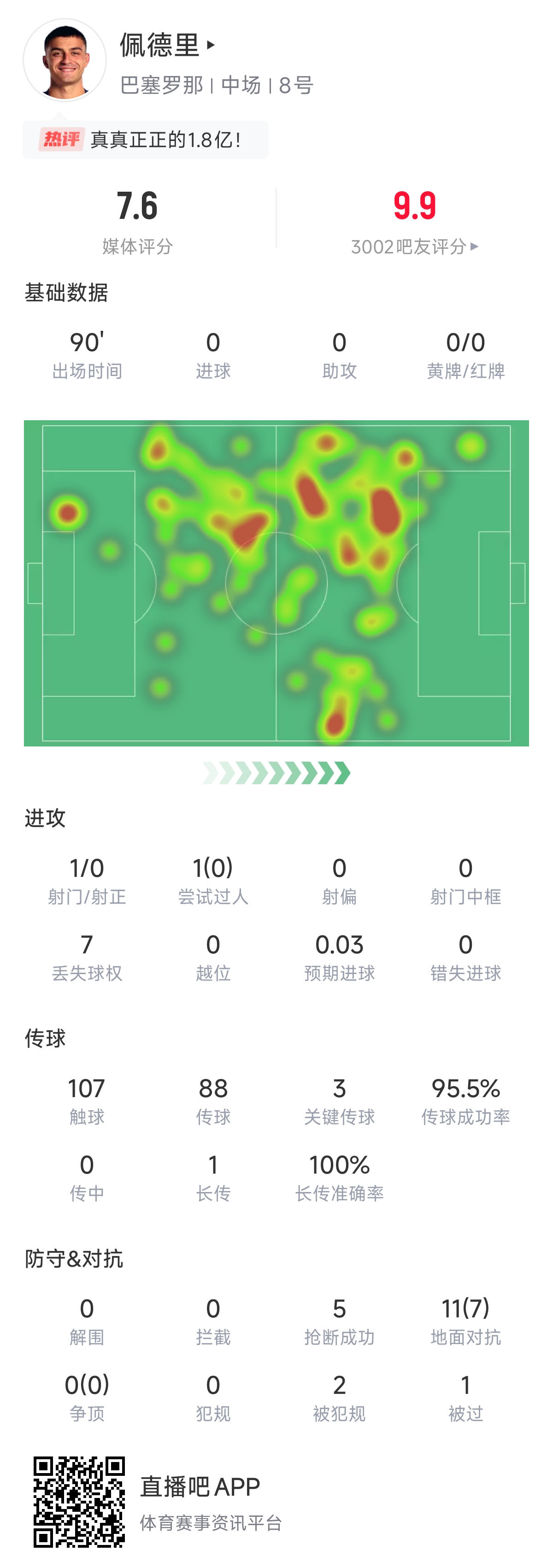 佩德里本賽季幾乎全勤,只缺席巴薩一場比賽,他在41場比賽里貢獻5球6助。不過進球數(shù)據(jù)并不能體現(xiàn)出佩德里的表現(xiàn)。例如他在本場比賽首發(fā)出戰(zhàn),貢獻3次關鍵傳球,觸球107次僅有7次丟失球權,傳球成功率達到95.5%,另外他還有5次搶斷以及7次地面對抗成功。