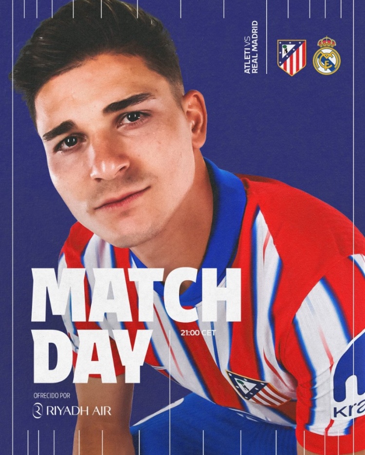 馬競(jìng)方面也發(fā)布海報(bào),上一場(chǎng)兩隊(duì)交手時(shí)取得進(jìn)球的阿爾瓦雷斯單人出鏡,右上角為對(duì)陣雙方隊(duì)徽。