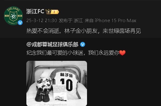 浙江隊社媒發(fā)文悼念:熱愛不會消逝。林子金小朋友,來世綠茵場再見。