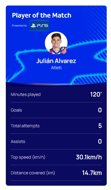 本場比賽阿爾瓦雷斯5次打門,跑動距離14.7km。