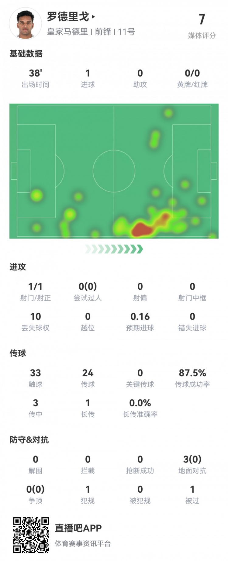 3月5日訊 正在進(jìn)行的歐冠1/8決賽首回合,皇馬主場暫1-1馬競。此役羅德里戈閃擊建功,球員半場重點(diǎn)數(shù)據(jù)如下↓