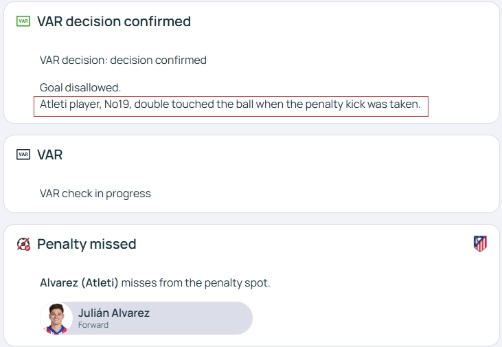 - 官方明確!歐冠官網:阿爾瓦雷斯罰點時2次觸球,VAR決定進球無效