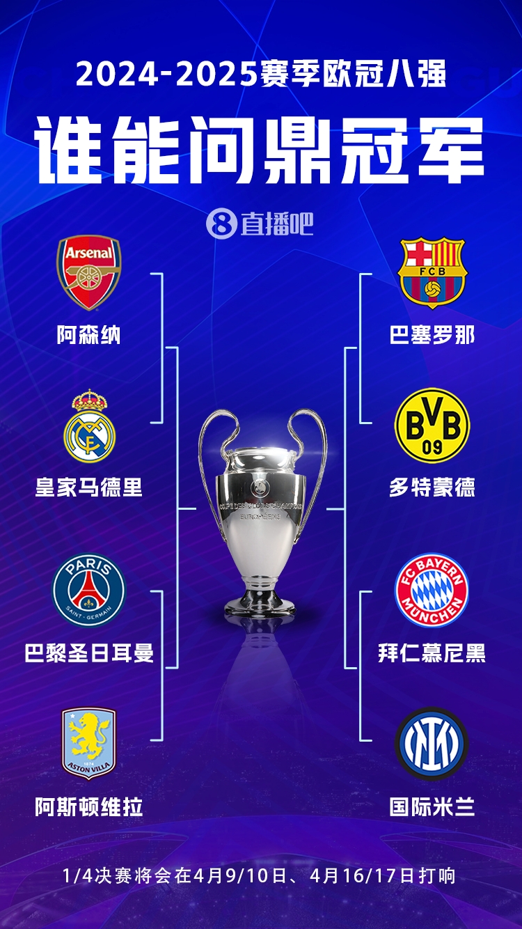 - 豪門之戰(zhàn)!歐冠8強(qiáng)全員五大聯(lián)賽,6隊(duì)拿過冠軍&槍手巴黎拿過亞軍
