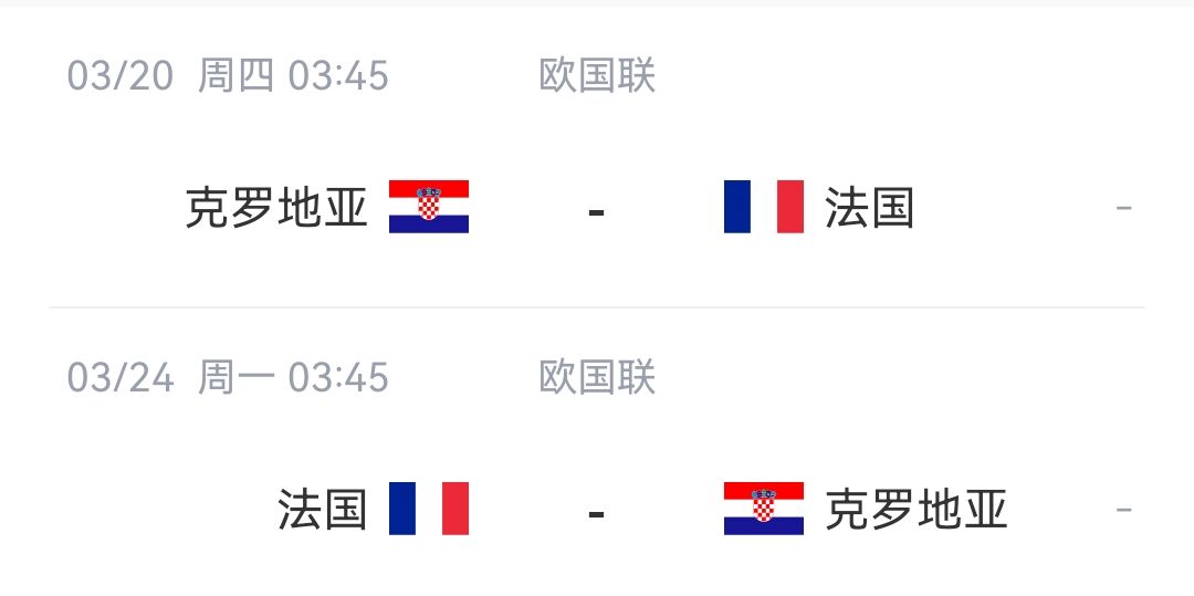 此前的歐國(guó)聯(lián)小組,法國(guó)隊(duì)力壓意大利、比利時(shí)和以色列以小組第一晉級(jí)淘汰賽,在1/4決賽中,他們要面對(duì)的是克羅地亞隊(duì)。法國(guó)與克羅地亞將在北京時(shí)間3月20日和3月24日凌晨進(jìn)行兩回合主客場(chǎng)的交鋒。