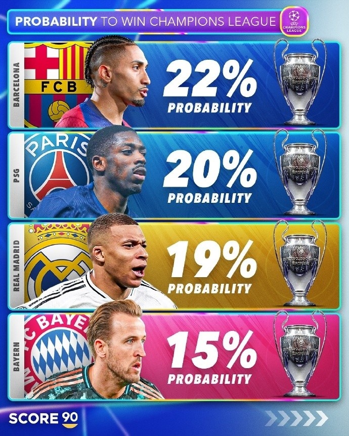 3月13日訊 歐冠1/4決賽賽程出爐后,外媒Score90也公布了各隊(duì)晉級(jí)概率和奪冠概率。