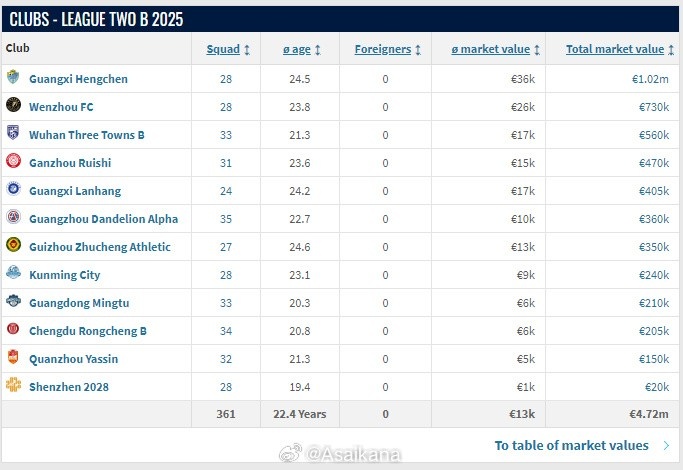 2025賽季中乙各隊名單已在轉(zhuǎn)會市場網(wǎng)更新。球隊總身價方面,山東泰山B隊以135萬歐元列第一,后面依次是無錫吳鉤(108萬歐)、廣西恒宸(102萬歐)、江西廬山(83.5萬歐)、杭州臨平吳越(83.5萬歐)、蘭州隴原競技(81萬歐)、上海海港B隊(74.5萬歐)、湖北青年星(74.5萬歐)、溫州(73萬歐)、南通海門珂締緣(71.5萬歐)、北京理工(70萬歐)、泰安天貺(64.5萬歐)、武漢三鎮(zhèn)B隊(56萬歐)、贛州瑞獅(47萬歐)、廣西藍航(40.5萬歐)、山西崇德榮海(37萬歐)、廣州蒲公英(36萬歐)、貴州筑城競技(35萬歐)、昆明城市(24萬歐)、廣東銘途(21萬歐)、長春喜都(21萬歐)、成都蓉城B隊(20.5萬歐)、泉州亞新(15萬歐)、深圳二零二八(2萬歐)。