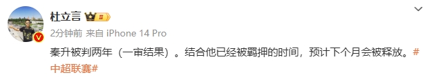 媒體人杜立言消息,秦升被判兩年(一審結(jié)果)。結(jié)合他已經(jīng)被羈押的時間,預(yù)計(jì)下個月會被釋放。