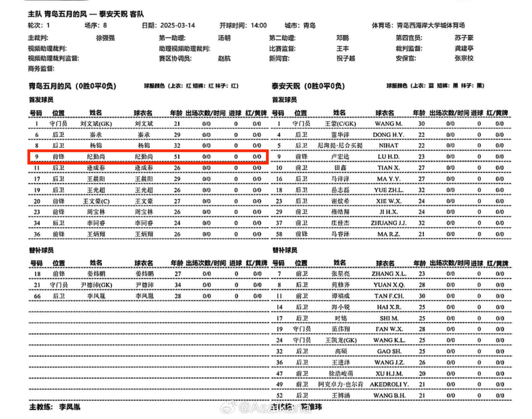 中冠球隊(duì)青島五月的風(fēng)將對陣中乙球隊(duì)泰安天貺。根據(jù)首發(fā)名單,青島五月的風(fēng)投資人、51歲的紀(jì)勤尚將先發(fā)出戰(zhàn),擔(dān)任前鋒。 ???