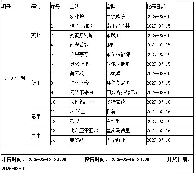 本周末的 傳足勝負(fù)彩第25041期中不乏焦點(diǎn):英超,曼城主場(chǎng)對(duì)陣布賴頓;德甲,拜仁慕尼黑客場(chǎng)出征柏林;意甲,AC米蘭主場(chǎng)迎戰(zhàn)科莫;西甲,皇馬做客對(duì)壘比利亞雷亞爾。