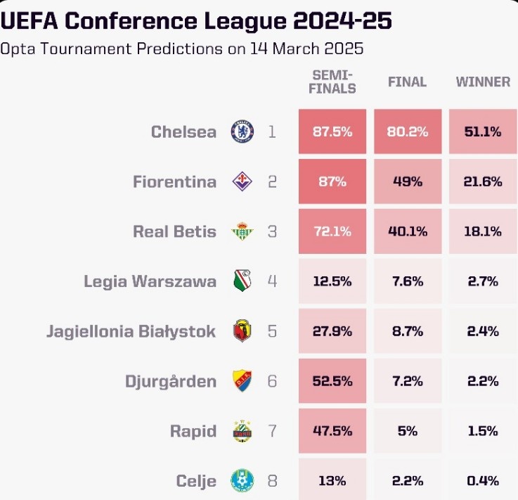 - OPTA列本賽季歐協(xié)聯(lián)奪冠概率:切爾西大幅領(lǐng)跑,貝蒂斯第三