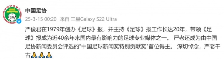 - 中國(guó)足協(xié)發(fā)文悼念《足球》報(bào)創(chuàng)刊人嚴(yán)俊君:深切悼念,嚴(yán)老千古