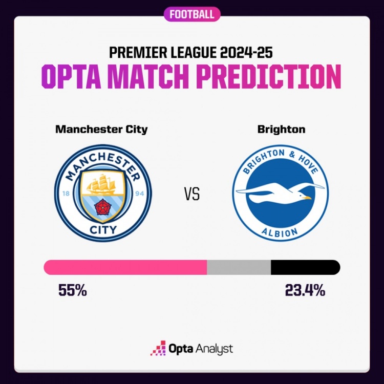 Opta對(duì)于本場(chǎng)比賽進(jìn)行了超級(jí)計(jì)算機(jī)模擬預(yù)測(cè),曼城獲勝概率55%,布萊頓獲勝概率23.4%,雙方戰(zhàn)平概率21.7%。