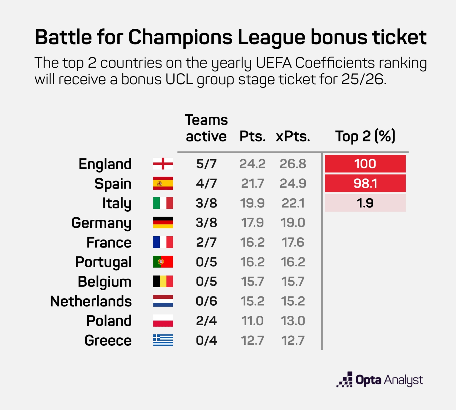 目前英格蘭手握24.25的積分,領(lǐng)先第二名西班牙2.5分。考慮到歐足聯(lián)系數(shù)分系統(tǒng)的運(yùn)作方式,在接下來的歐戰(zhàn)1/4決賽階段,只要有一支英格蘭球隊(duì)贏得一場比賽,就可以為英超鎖定一個(gè)額外的歐冠聯(lián)賽席位。