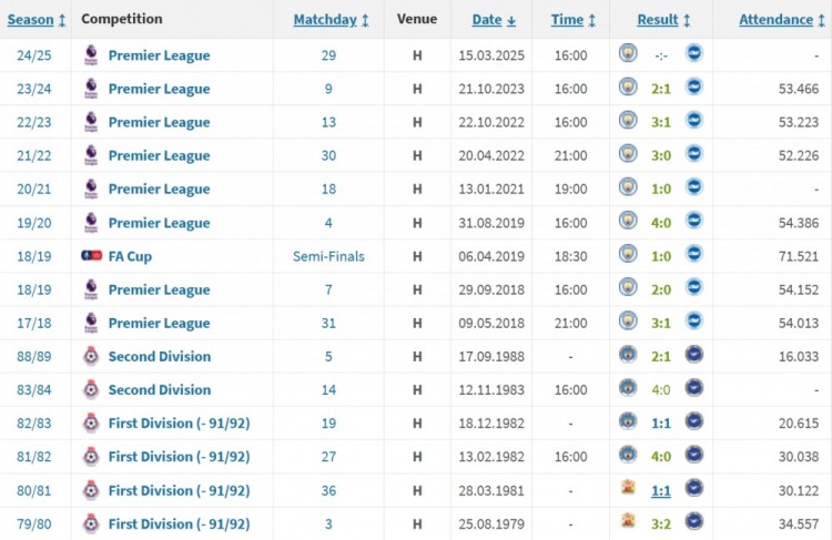 - 12勝2平,曼城歷史上各項賽事主場對陣布萊頓未嘗敗績