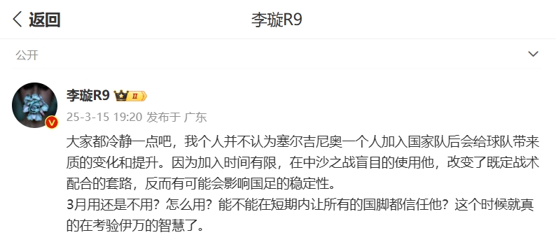 李璇寫道:大家都冷靜一點(diǎn)吧,我個(gè)人并不認(rèn)為塞爾吉尼奧一個(gè)人加入國家隊(duì)后會(huì)給球隊(duì)帶來質(zhì)的變化和提升。因?yàn)榧尤霑r(shí)間有限,在中沙之戰(zhàn)盲目的使用他,改變了既定戰(zhàn)術(shù)配合的套路,反而有可能會(huì)影響國足的穩(wěn)定性。