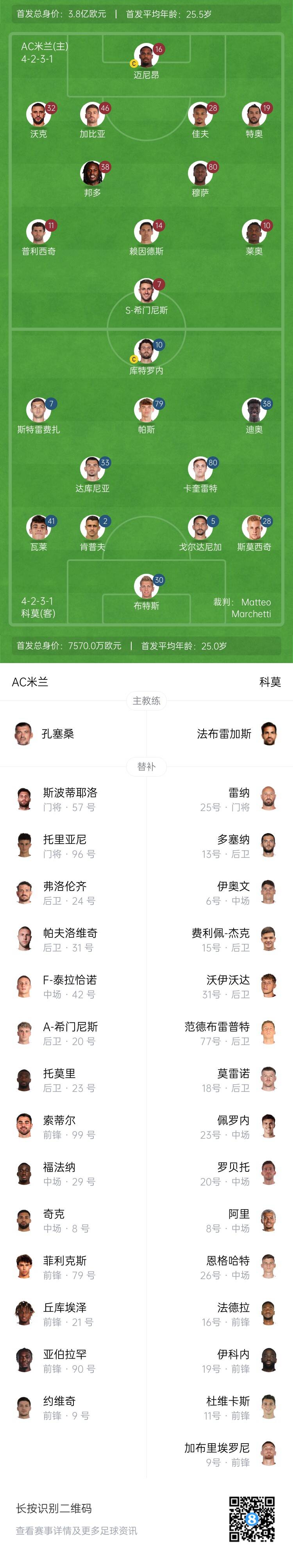 3月16日訊 意甲第29輪,AC米蘭主場(chǎng)對(duì)陣科莫。賽前,官方公布了本場(chǎng)的首發(fā)名單。