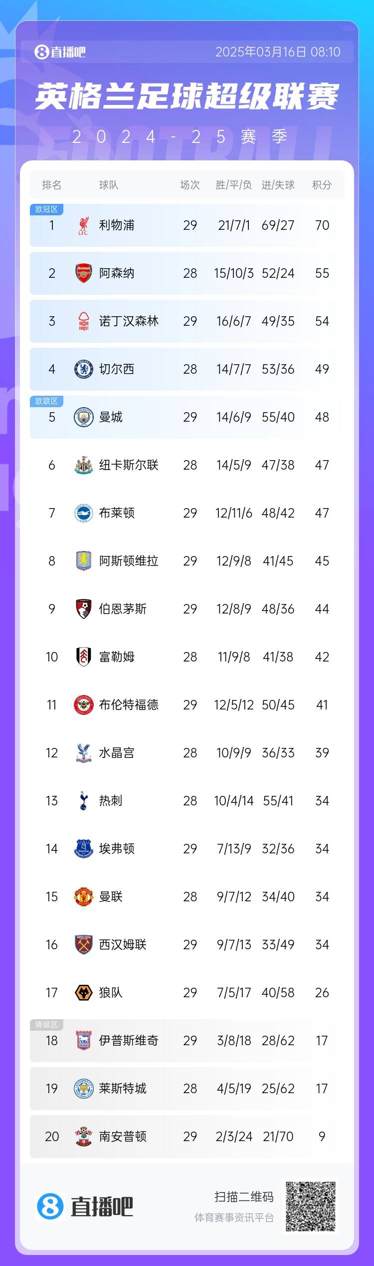 南安普頓29輪之后只有9分,基本是穩(wěn)穩(wěn)降級(jí)。同在降級(jí)區(qū)的伊普斯維奇本輪2-4不敵諾丁漢森林,萊斯特城還未賽,本輪將戰(zhàn)曼聯(lián)。