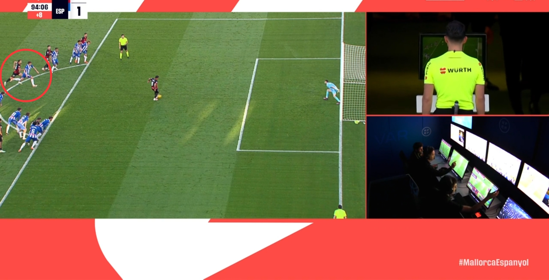 第92分鐘,VAR介入,主裁親自查看回放,此前西班牙人球員和馬略卡球員同時(shí)提前進(jìn)入禁區(qū)?。ň嚯x點(diǎn)球點(diǎn)不滿9.15米),并對(duì)比賽產(chǎn)生影響,主裁判罰點(diǎn)球重罰↓