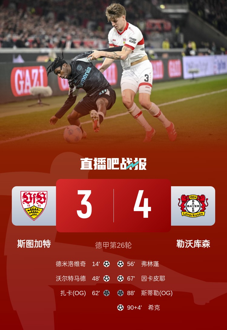 希克補(bǔ)時(shí)頭球絕殺,勒沃庫森4-3逆轉(zhuǎn)斯圖加特。積分榜方面,勒沃庫森落后拜仁6分。