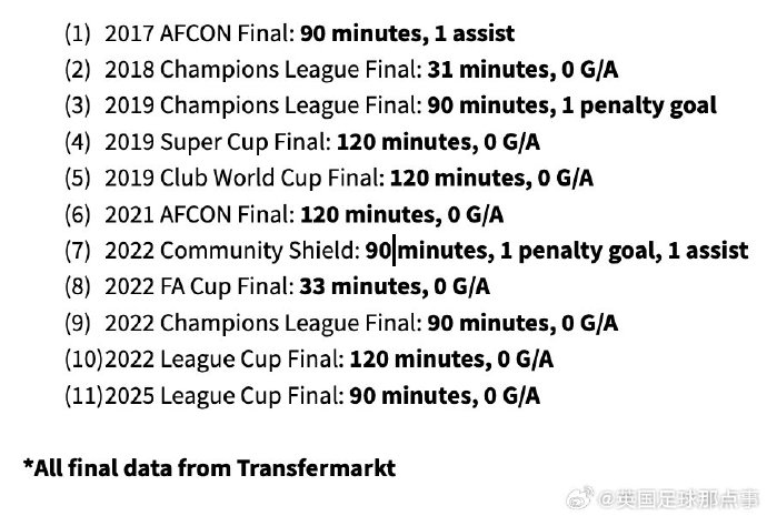 Transfermarkt:薩拉赫至今已代表俱樂部和國家隊參加了11場決賽,累計出場約1000分鐘,但從未打入非點球進球。